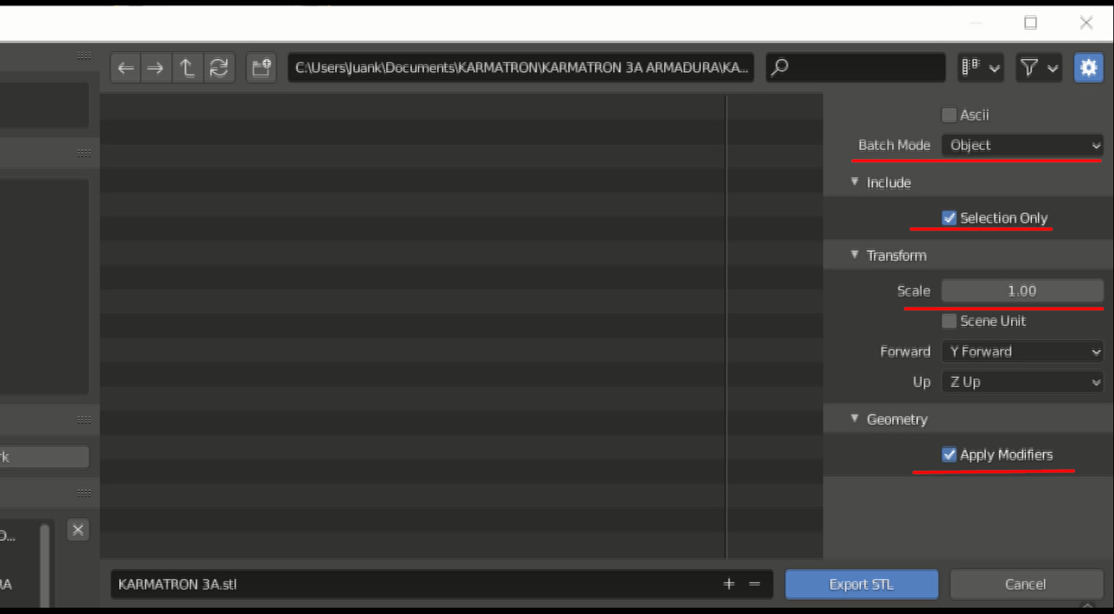 Una vez escalada la base y habiendo activado todos los modificadores como el subsurface ademas de seleccionar las piezas que se exportan a «.stl» con el Batch mode como objeto marcando que solo los elementos seleccionados Selection Only son los que se exportarán, la Escala en 1 y la opción Apply Modifiers activo.