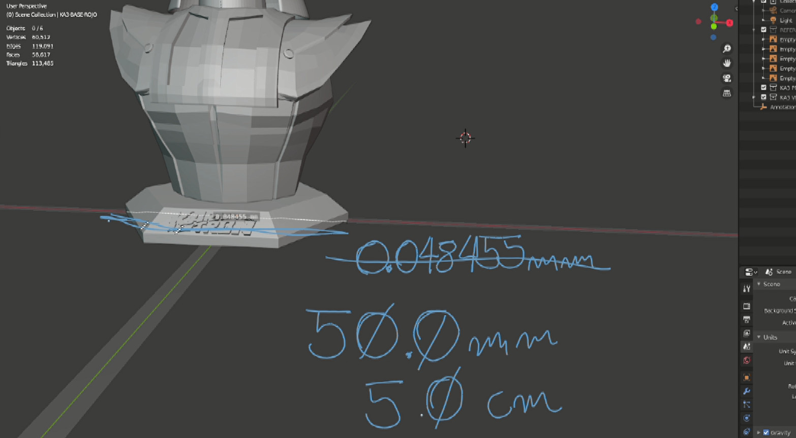 Lo primero fue ver cual era la escala real que en si era exageradamente pequeña, 0.048455 mm de ancho la idea en si es mantener los 50 mm (5cm) de la base y a partir de eso los demás elementos se escalaran proporcionalmente ya que se encuentran emparentados.